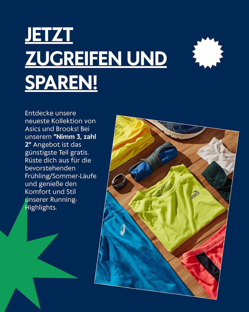Entdecke unsere neueste Kollektion von Asics & Brooks und sichere dir unser starkes Angebot:👉 Nimm 3, zahl 2 – das günstigste Teil gibt’s GRATIS!